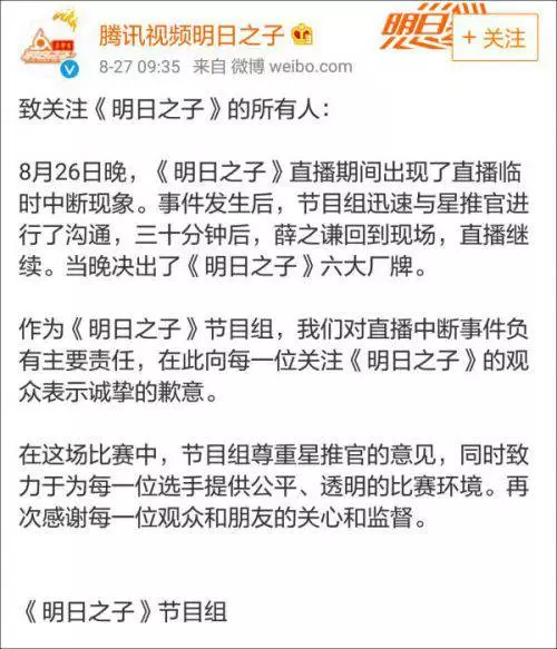 七进六: 明日之子大概是史上第一个现场直播如此尴尬的节目吧,当初立牌坊夸口自己是档直播的公正节目,结果现在啪啪打脸,就不说你们怎么套路老薛的,光说说“薛之谦摔话筒”这个热搜为什么可以长居第一一晚上,而“明日之子黑幕”却转瞬即逝,你就说你们尴不尴尬,大概是中国综艺史上第一个全场大喊“黑幕”还得尴尬做下去的节目......“又当又立”的牌坊送给你们节目组